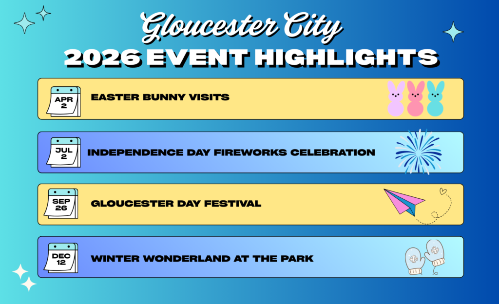 | Gloucester City’s annual traditions bring our community together in every season, and several of our major celebrations are already on the calendar. These larger events offer residents and visitors alike the chance to take part in the community spirit that defines our city. Additional details will be shared as each date approaches, and more events will be added throughout the year. Easter Bunny Visit — April 2 at 5:30 PM | Location TBDA family favorite returns with photos, treats, and a cheerful spring celebration. Final location will be announced soon. Independence Celebration — July 2 | Proprietors Park An evening of music, food, and community leading up to a spectacular fireworks display over the Delaware River. A highlight of the summer season and one of Gloucester City’s most beloved waterfront traditions. Gloucester Day — September 26 | Proprietors Park Fall Season activities, craft and food vendors, music, and family‑friendly fun fill the day. Winter Wonderland — December 12 | Proprietors Park Festive activities and Santa visits for all ages as we celebrate the holiday season together along the waterfront. Residents, organizations, and small businesses interested in vending at any Gloucester City event may email lryan@cityofgloucester.org for information and registration. |