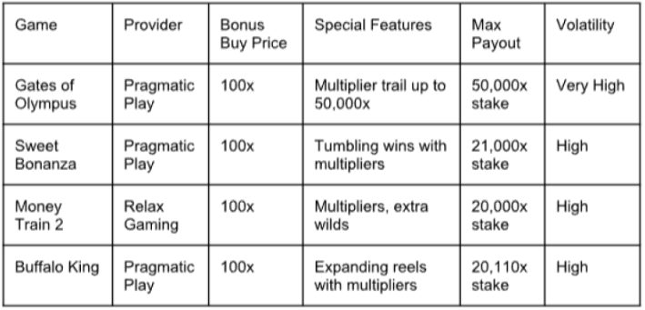 As shown in the table, top Bonus Buy slots can have incredible payout potential in the thousands or even tens of thousands times the original stake.