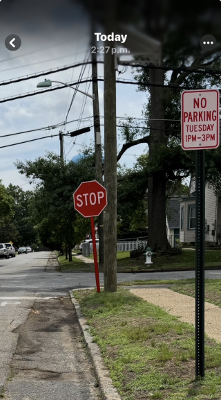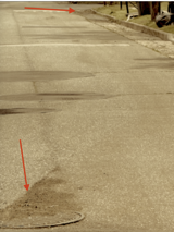 Another photo shows what was left behind in the middle of the street as a result of the sweeper operator navigating around a car that was obstructing his path. As he drove over a manhole cover, dirt was left behind, illustrating a trail of debris as the sweeper traveled south.