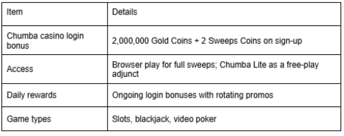 Before diving into specifics, here’s a clean snapshot of the opening offer Canadians usually see with Chumba casino, followed by a short wrap-up you can use as a mental checklist.