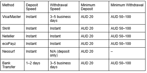 Casino Mate pays out instantly through e-wallets once approved. Bank transfers take three to five business days. Minimum withdrawals usually sit at AUD 50 or AUD 100.