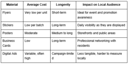 To illustrate, consider that producing 500 flyers typically costs less than running a single sponsored online ad targeting the same neighborhood. Stickers, meanwhile, can be ordered in bulk at a low price and distributed gradually, extending their value over time.