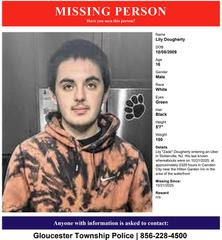 On 10/21/2025, at approximately 4:22 a.m. Lily “Zade” Dougherty (10/08/2009) was reported missing. Zade left his residence located in Sicklerville and was last seen entering an Uber at the corner of Bluestone and Mullen Dr in Sicklerville. His clothing description is unknown. Zade is approximately 5’7″ in height and 150 pounds in weight. He has black hair and green eyes. His last known whereabouts were on 10/21/2025, at approximately 3:26 a.m. in Camden City near the Hilton Garden Inn in the area of the waterfront.