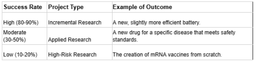 The table above shows the inverse relationship between the likelihood of success and the potential reward.While incremental research can provide a higher chance of successful studies outcomes, they tend to yield low returns on that investment. High-risk research can still be a bit precarious, but the possible upside can be transformational.