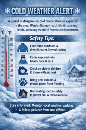 “As temperatures fall to dangerously low levels, it is critical that our residents have access to a safe place to stay warm,” said Commissioner Jonathan Young, liaison to the Camden County Department of Public Safety. “We urge everyone to check in on vulnerable neighbors, ensure heating systems are working properly, and bring pets indoors.”