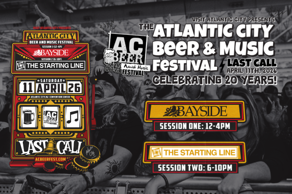 | The Atlantic City Beer & Music Festival returns to the Atlantic City Convention Center and this year it’s Last Call!Join us on Saturday, April 11th, as we celebrate the 20th anniversary of the East Coast’s ultimate craft beer celebration, where thousands of craft beer lovers will flock to this seaside city for a day of brews, tunes, shenanigans and more! RAISE A GLASS |
