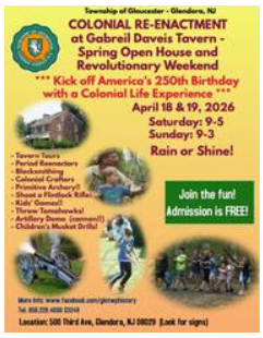 THIS WEEKEND! The Gloucester Township Historic & Scenic Preservation Committee is hosting their annual Colonial Re-Enactment on April 18th from 9am-5pm and April 19th from 9am-3pm at the Gabreil Daveis Tavern (500 Third Ave).