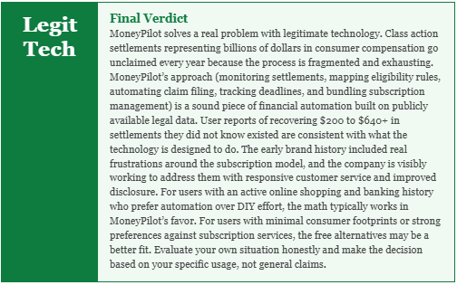 Disclaimer: This article is for informational purposes only and does not constitute legal or financial advice. MoneyPilot does not guarantee settlement payouts, and eligibility is determined by courts and settlement administrators. Class action payouts are subject to court schedules and can take extended periods to resolve. Individual results vary based on consumer history and the specific settlements available at the time of filing. This review is based on publicly available user reviews, company documentation, and publicly reported information as of April 2026.
