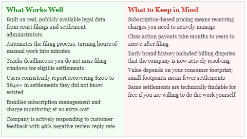 The consistent thread in these reports is that users found real settlements, completed real filings, and in several cases have already received real checks. That is what the product is designed to do, and when it works, it works as advertised.