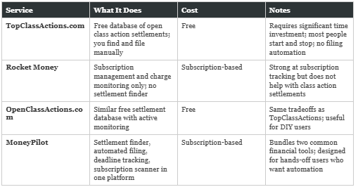 MoneyPilot is not the only option in this space, though the combination of settlement filing plus subscription management in one dashboard is relatively rare. Here is how it stacks up against the main alternatives.