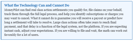 The company explicitly states that it does not guarantee payouts, does not act as a law firm, and does not make eligibility decisions. All claim approvals and payments are handled by courts and official settlement administrators. MoneyPilot’s role is strictly in the discovery, filing, and tracking layer.