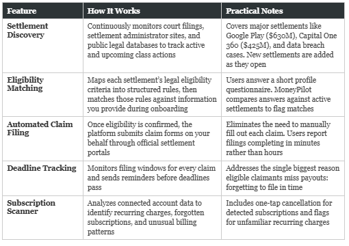 MoneyPilot automates this by maintaining integrations with settlement claim portals and submitting the required information programmatically. Users report filing claims for multiple settlements within minutes rather than hours. One Trustpilot reviewer described it as “literally 2 minutes per claim.”