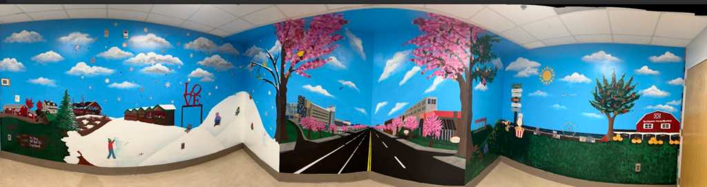 The mural, which wraps around three walls of a 3rd floor waiting room on Jefferson’s campus,   measures 50 feet x 8 feet, and uses mediums such as acrylic paint, glass mosaics, ceramic tile and photo paper to depict seasonal scenes representative of the New Jersey and Philadelphia region.