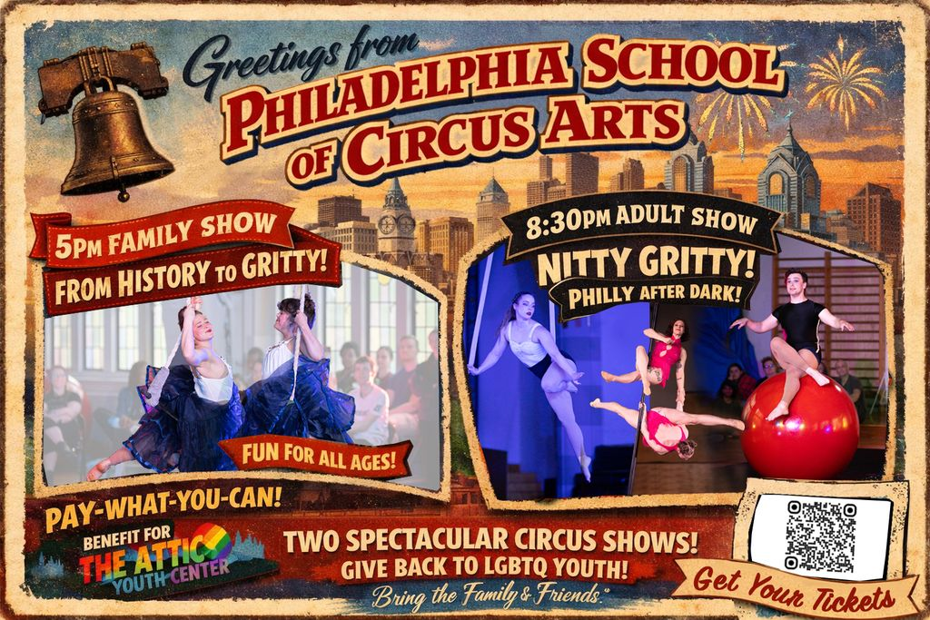 Close out Philadelphia School of Circus Art’s World Circus Day celebration with “Nitty Gritty,” a bold, late-night circus cabaret that leans into the wild, weird, and wonderfully gritty side of Philadelphia. This high-energy, adult-themed performance features PSCA’s faculty artists cutting loose with daring acts, irreverent humor, and a playful nod to the city’s rough-around-the-edges reputation. Expect jaw-dropping aerials, thrilling acrobatics, and mischievous moments as our performers revel in the idea that sometimes the best stories come from when things don’t go quite right in Philly. It’s circus with attitude—raw, energetic, and full of hometown pride.