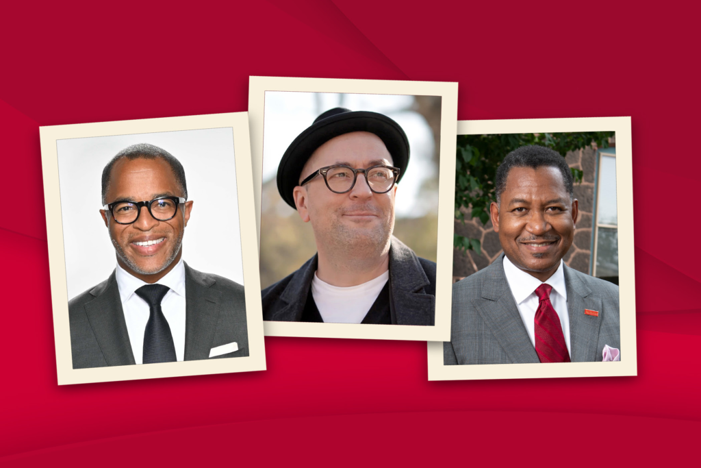 (From l. to r.) Journalist Jonathan Capehart, screenwriter Christopher Markus and Chancellor Antonio D. Tillis will address graduates at ceremonies in May.