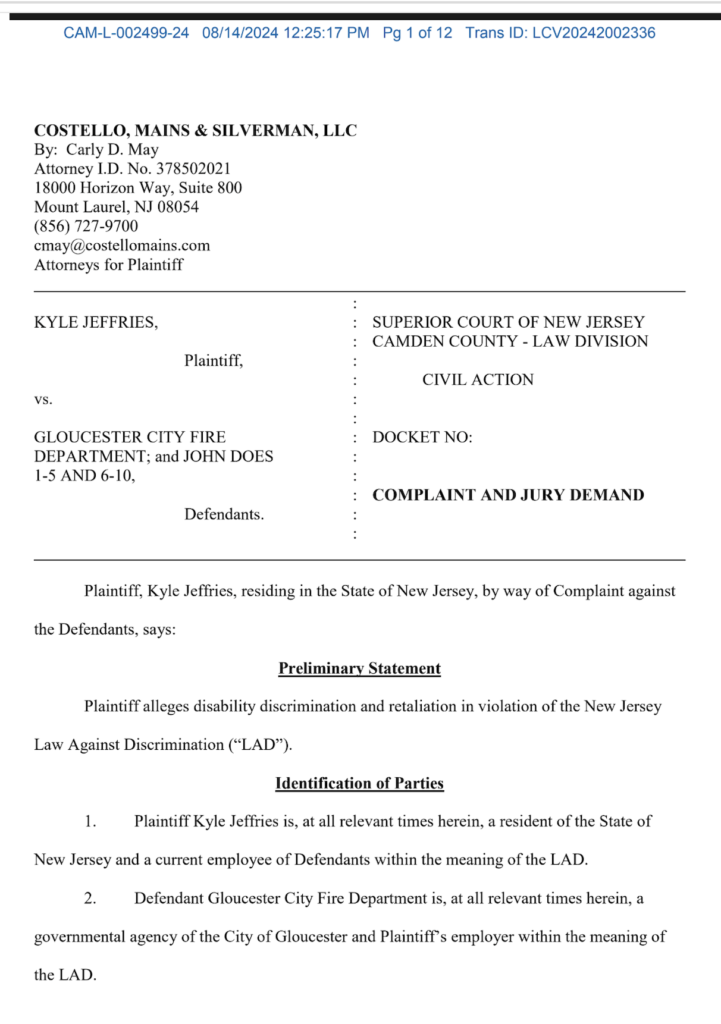 The source for the $45,000 payout by Gloucester City is a March 27, 2026, report by Transparency NJ, written by open‑government advocate John Paff. The article details the settlement of a lawsuit filed by firefighter Kyle Jeffries, (photo) who alleged disability discrimination, harassment, and retaliation within the Gloucester City Fire Department. The city agreed to pay $45,000 to resolve the case — $23,804 to Jeffries for emotional distress and $21,196 for attorney fees.