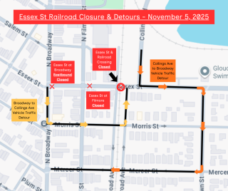 On Wednesday, November 5, 2025, Essex St will be closed to all traffic beginning at 7:00 AM for approximately 24 hours due to Conrail repairing the railroad crossing.  Essex St will be closed from Broadway to Railroad Ave (North).  All tractor trailer traffic should use the Exit 4, Holtec Blvd, from I-76.  There will be no open truck routes from Collings Ave. See map for detours and closures.