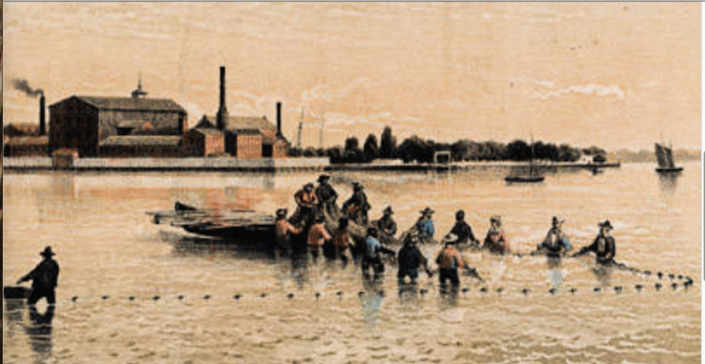GLOUCESTER CITY, NJ(December 3, 2025)(CNBNews)–The men are shad fishing, on the Delaware River, in Gloucester City. In the distance is the Gloucester City Bleaching Mill. A bleaching mill is a facility, often part of a larger pulp or paper mill, that uses a series of chemical processes to whiten wood pulp by removing lignin. Historically, the term could also refer to an early textile mill that used sun and air to bleach cloth. In modern usage, it almost exclusively refers to a plant where pulp is treated with chemicals like chlorine dioxide or hydrogen peroxide to achieve the brightness and purity required for paper production. The
