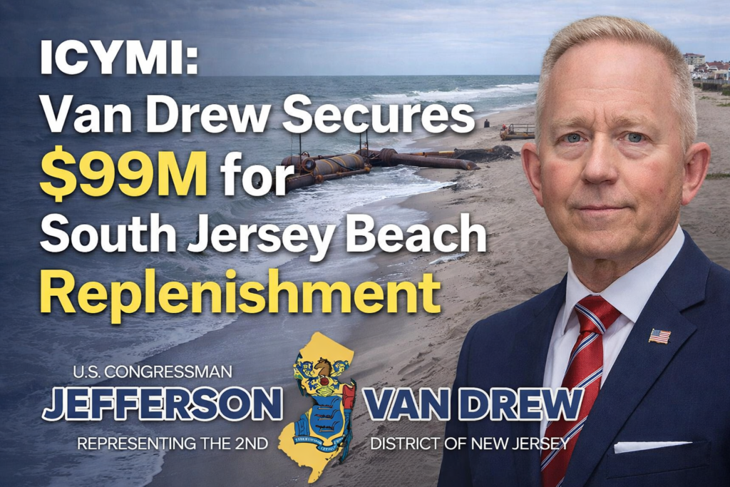 Congressman Van Drew announced that South Jersey will receive $99 million in federal funding from the U.S. Army Corps of Engineers to replenish and protect key beaches in the region. This is the biggest investment in New Jersey beach projects in a year without a severe coastal storm.